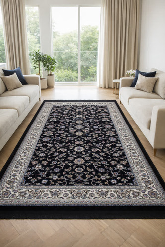 فرش کاشان زمینه سرمه ای جنس بی سی اف هیت ست شده کد 1007
