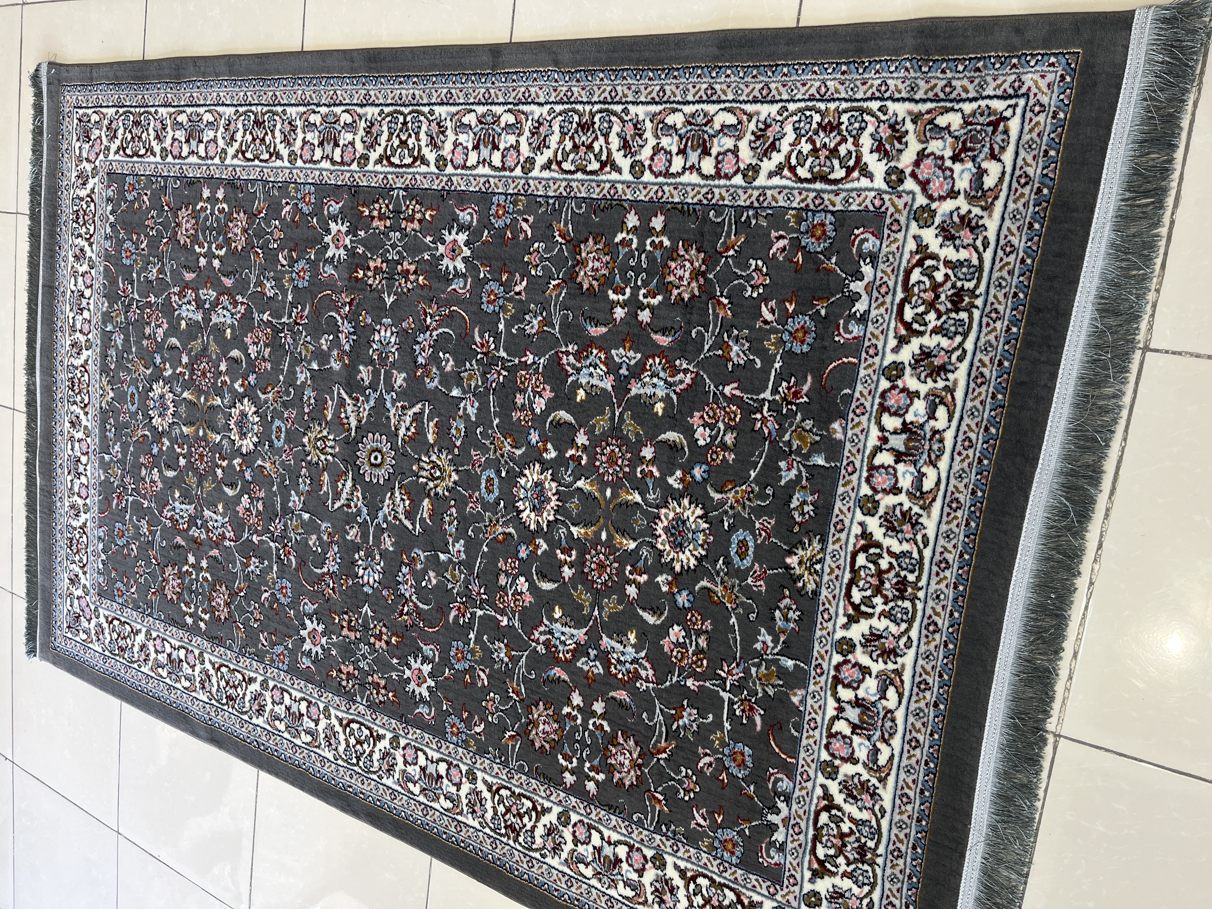 فرش ماشینی کاشان زمینه دودی جنس بی سی اف هیت ست شده کد 1007